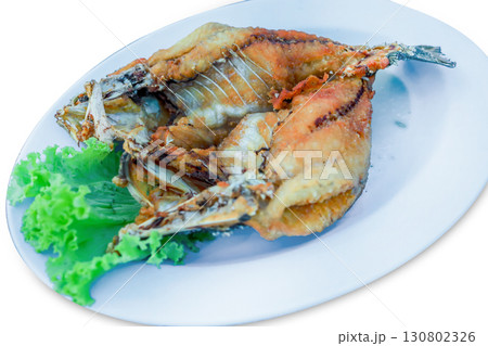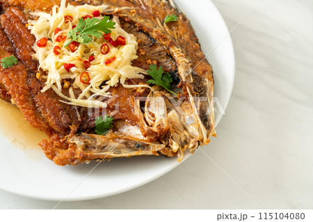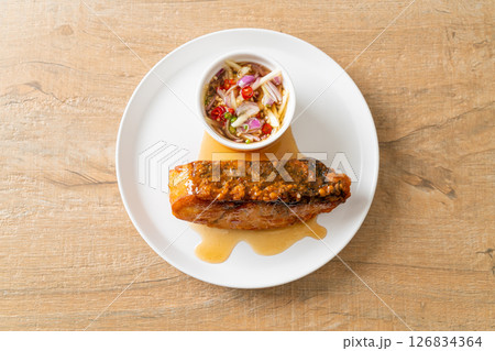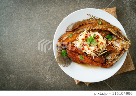 Top view of Deep-fried Sea bass with Fish Sauce, focus selective