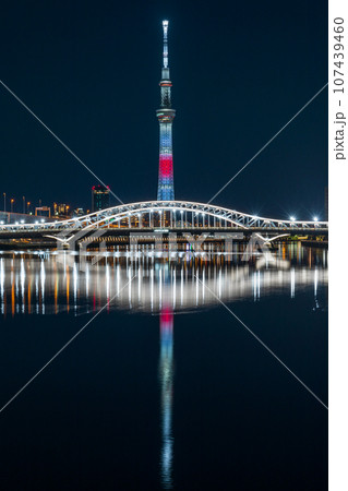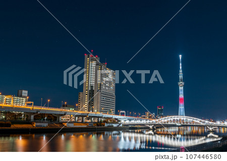 從東京潮入公園看到的東京晴空塔,日本國旗影像中的特殊照明