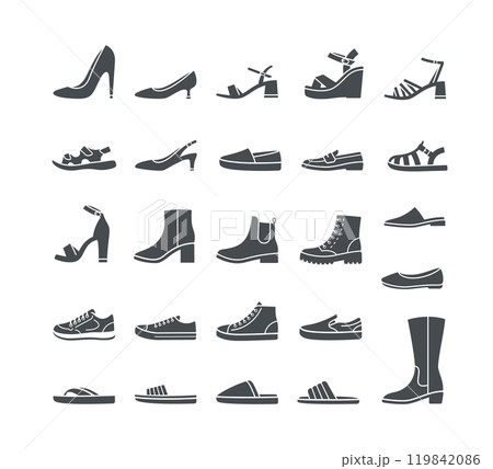 Women shoes collection. Basic types of footwear for lady. High heels, sandals, boots, flats, loafers, slippers. Simple solid silhouette icons for clothing shop. Side view pictograms, isolated