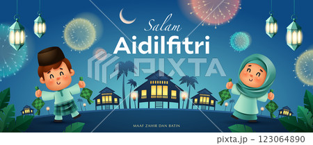 Joyful Salam Aidilfitri Celebration in a Festive Village Fireworks Night