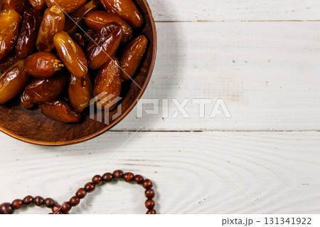 Dates fruit and rosary on white wooden table. Top view