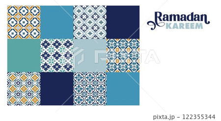 Ramadan Kareem greeting card, invitation. Festive web banner. Modern geometric flat design. Traditional arabic ornaments, patterns. Azulejo tiles. Colorful squares. Vector illustration background.