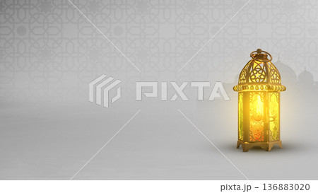 Beautiful golden Arabic lantern glowing with warm light on a minimalist grey background with Islamic patterns and mosque silhouette. Ideal for Ramadan and Eid greeting designs