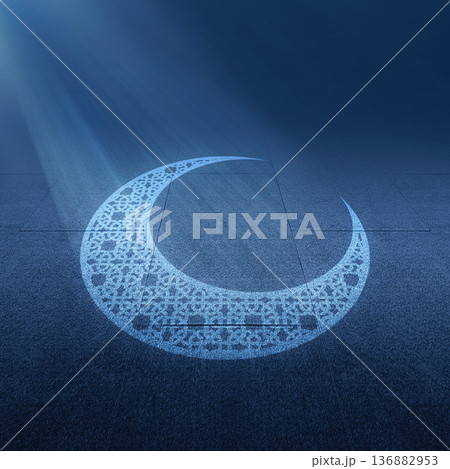 A beautiful blue glowing crescent moon with an intricate Islamic geometric pattern on a tiled floor with light rays, perfect for Ramadan and Eid celebrations