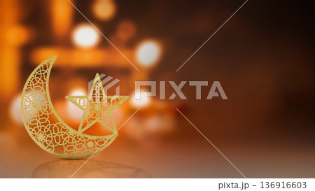 A golden glittery crescent moon and star ornament featuring intricate geometric patterns set against a warm, festive bokeh light background with ample copy space