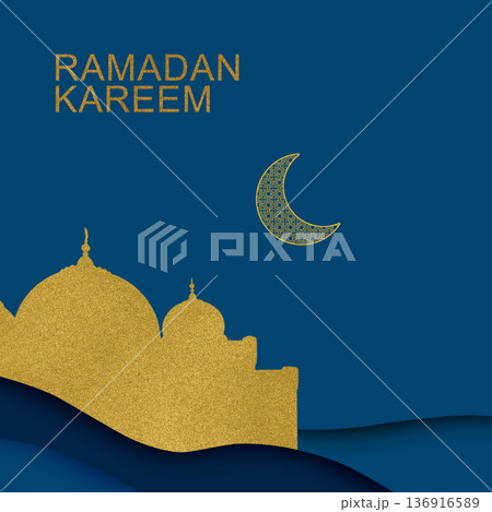 Illustration for Ramadan featuring a golden glitter mosque silhouette and a decorative crescent moon against a layered dark blue background. Elegant typography reading RAMADAN KAREEM in gold