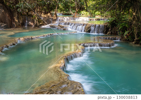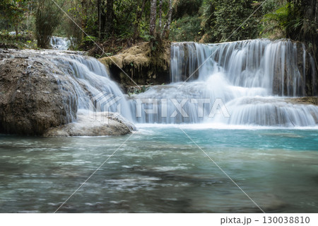 Kuang Si Waterfall flowing into a clear blue forest river in Luang Prabang, Laos