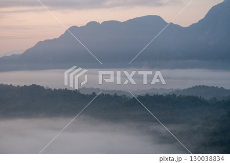 Foggy morning over tropical forest with mountain landscape in the background at Phadeng Peak, Luang Prabang, Laos