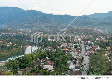Scenic view from Phousi Hill of town in Luang Prabang, Laos with mountains in the background under cloudy sky