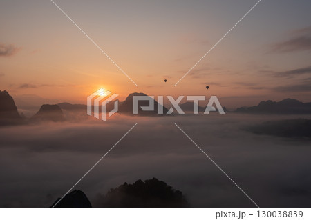 Hot air balloons flying over misty mountains at sunrise for scenic adventure at Phadeng Peak, Luang Prabang, Laos