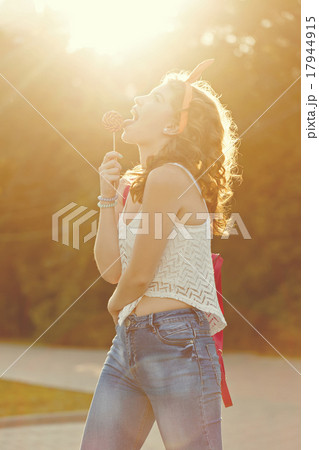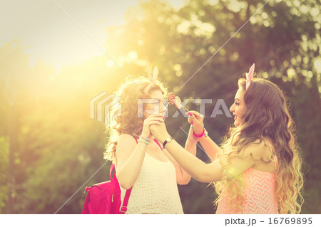 Best girlfriends playing with lollipops. Sunset.