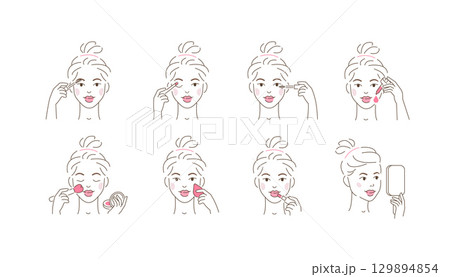 Set of cosmetic and makeup icon. Vector visage or face professional accessory for woman fashion. Beauty and facial skincare kit item. Lipstick and eyeliner, mascara, powder, mirror, bronzer, lipstick.