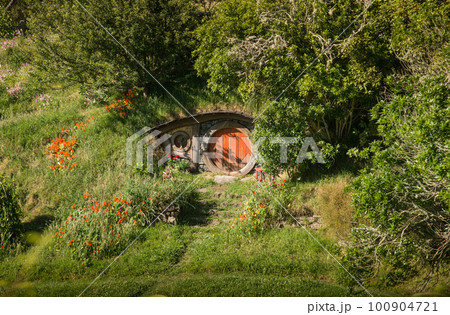 Scenery view of the "Bag End" home of Bilbo and Frodo Baggins from the Hobbiton movie set in Alexander Farm, New Zealand.