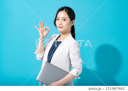 一位穿著西裝的職業女性做出「OK」手勢