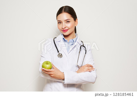 Afro pregnant woman choosing between sweet and fruit, looking at donut over white background