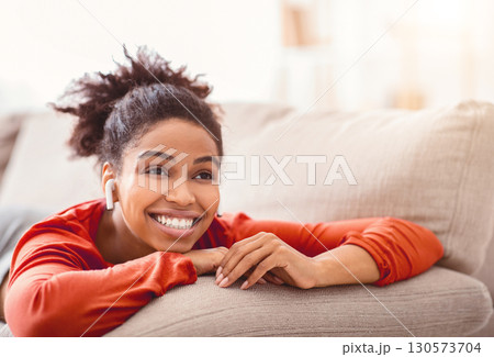 Happy Black Woman In Earbuds Listening To Music Relaxing Lying On Sofa Enjoying Weekend At Home. Selective Focus
