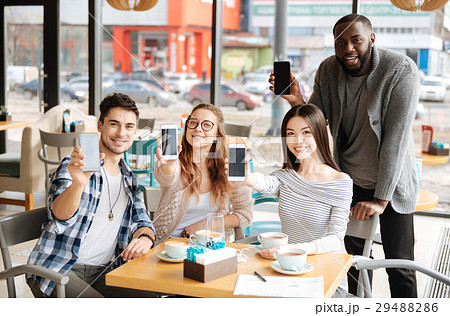 Youngsters with smartphones resting in the cafe