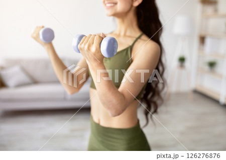 Closeup of young Indian lady exercising with dumbbells at home during covid quarantine, selective focus. Unrecognizable Asian woman strengthening her arm muscles, having domestic strength training