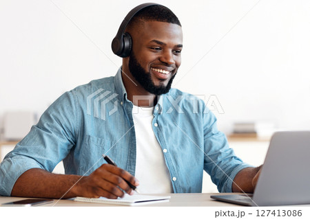 Online Education. Smiling Black Guy In Headphones Study With Laptop And Taking Notes, Cheerful Millennial African American Man Using Computer And Writing Down Information, Enjoying Distance Learning