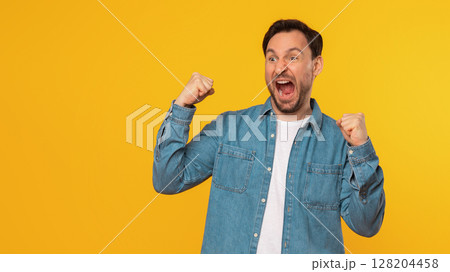 A man wearing a blue denim shirt with a white t-shirt underneath celebrates his success, with a big grin and both fists raised in the air. He stands against a bright yellow background, copy space