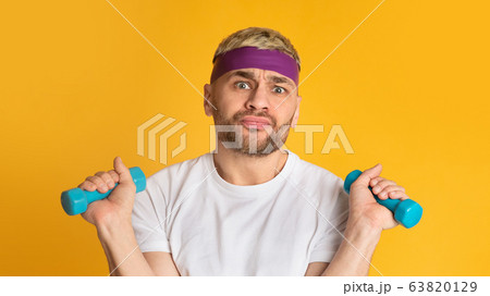 Bored millennial guy doing exercises, free space