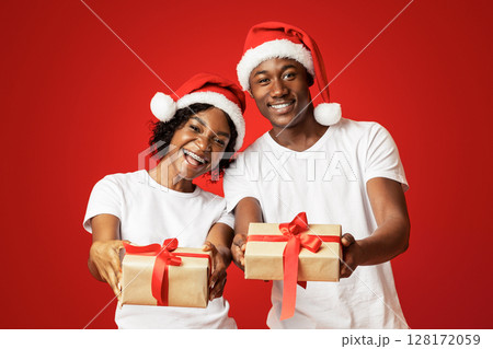 Lovely black couple showing their Christmas gift over orange studio background, copy space. Happy african american family wearing Santa hats and celebrating New Year 2021 together, holding present