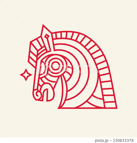 Minimalist red line art illustration of a stylized horse head with geometric patterns and abstract shapes