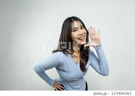 happy and hysterical young asian girl with her body bent over with both hands covering her mouth as if to invite something, the woman is wearing a blue casual top, white background