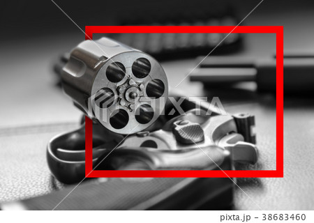 Red paper frame with .357 Caliber Revolver Pistol