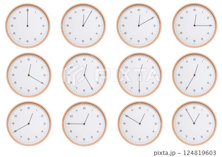 A set of twelve analog wooden wall clocks with white face and black hands, showing 5-minute intervals from 00:00 AM / PM to 00:55 AM / PM. Clean white background, perfect for time, routine, and