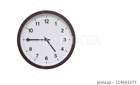 A simple round wall clock with a dark brown frame and a white face displaying 04:45/16:45. Isolated on a white background, perfect for time-related concepts, deadlines, and schedule themes.