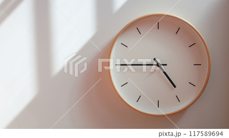 Minimalist wooden Wall Clock on White Wooden Surface with Space for Text. Time Set at 16.45/04.45