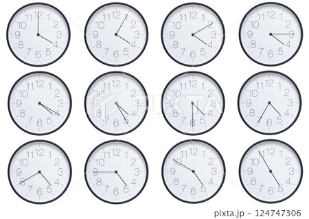 A set of twelve round wall clocks with dark brown frames and white faces showing 5-minute time intervals from 04:00 or 16:00 to 04:55 or 16:55. Clean white background, ideal for time, schedule, and