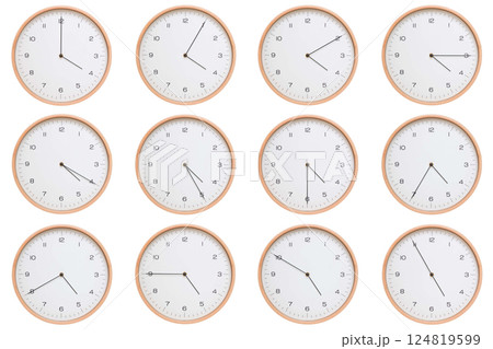 A set of twelve analog wooden wall clocks with white face and black hands, showing 5-minute intervals from 04:00 AM / PM to 04:55 AM / PM. Clean white background, perfect for time, routine, and