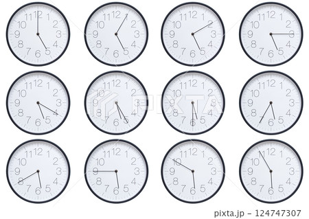 A set of twelve round wall clocks with dark brown frames and white faces showing 5-minute time intervals from 05:00 or 17:00 to 05:55 or 17:55. Clean white background, ideal for time, schedule, and