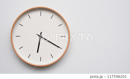 Minimalist wooden Wall Clock on White Wooden Surface with Space for Text. Time Set at 18.20/06.20