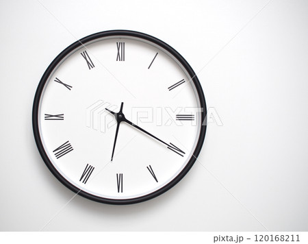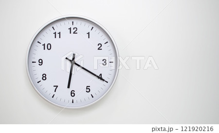 Classic Black-Edged Clock on White Background at 18.20/06.20 - Perfect for Time Management and Text Space