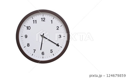 A simple round wall clock with a dark brown frame and a white face displaying 06:20/18:20. Isolated on a white background, perfect for time-related concepts, deadlines, and schedule themes.