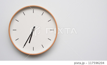Minimalist wooden Wall Clock on White Wooden Surface with Space for Text. Time Set at 18.35/06.35