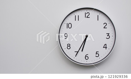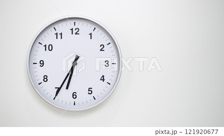 Minimalist White Clock with Silver Frame Striking 18.35/06.35 on White Background. Perfect for Time Management and Corporate Campaigns