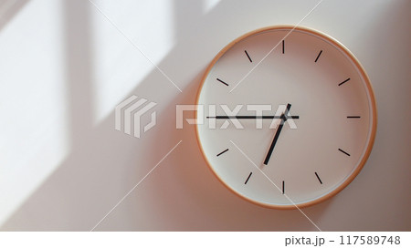 Wall Clock Showing 18.45/06.45 O'Clock on White Wooden Surface - Perfect for Time Management and Scheduling Concepts