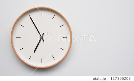 Minimalist wooden Wall Clock on White Wooden Surface with Space for Text. Time Set at 18.55/06.55
