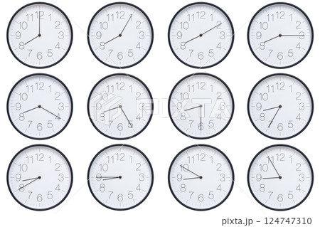 A set of twelve round wall clocks with dark brown frames and white faces showing 5-minute time intervals from 08:00 or 20:00 to 08:55 or 20:55. Clean white background, ideal for time, schedule, and