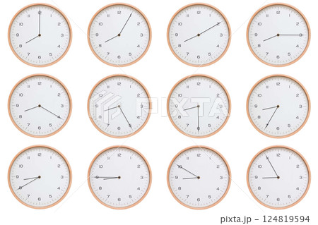 A set of twelve analog wooden wall clocks with white face and black hands, showing 5-minute intervals from 08:00 AM / PM to 08:55 AM / PM. Clean white background, perfect for time, routine, and