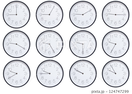A set of twelve round wall clocks with dark brown frames and white faces showing 5-minute time intervals from 09:00 or 21:00 to 09:55 or 21:55. Clean white background, ideal for time, schedule, and