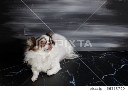 Long haired chihuahua dog closeup portrait isolated on black background. copy space.