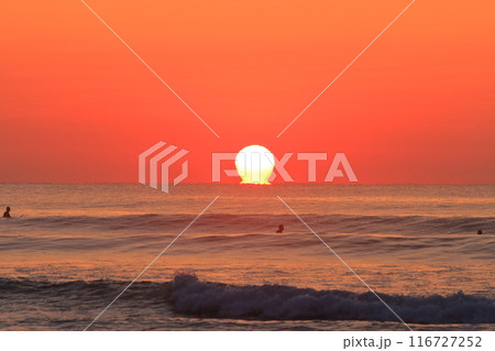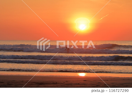 宮崎縣大倉濱,衝浪者在衝浪時觀看海上日出
