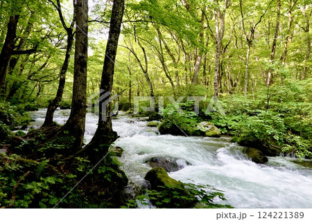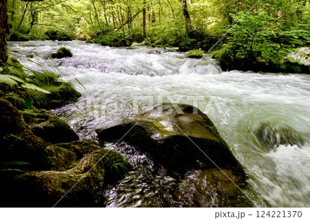 青森縣十和田市奧入瀨溪流的鮮綠和潺潺溪流