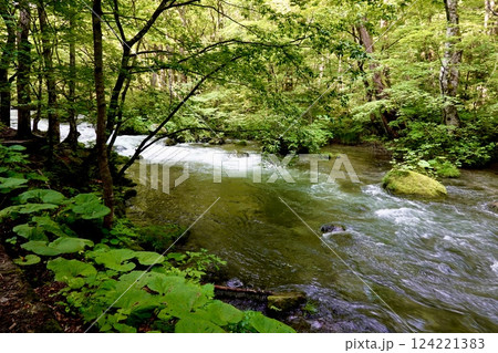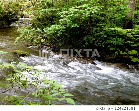 青森縣十和田市奧入瀨川與102號國道交界處的綠色景觀