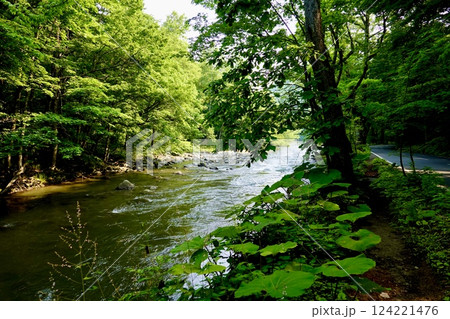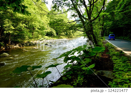 青森縣十和田市奧入瀨溪沿岸的102號國道,清爽的綠色風景